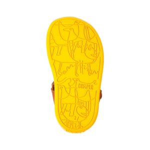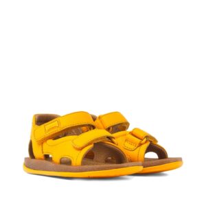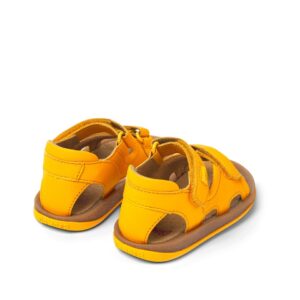 Κίτρινα δερμάτινα παιδικά πέδιλα με σύστημα κλεισίματος με άγκιστρο και θηλιά και εξωτερικές σόλες από λάστιχο (20% ανακυκλωμένο).