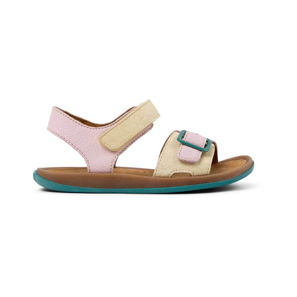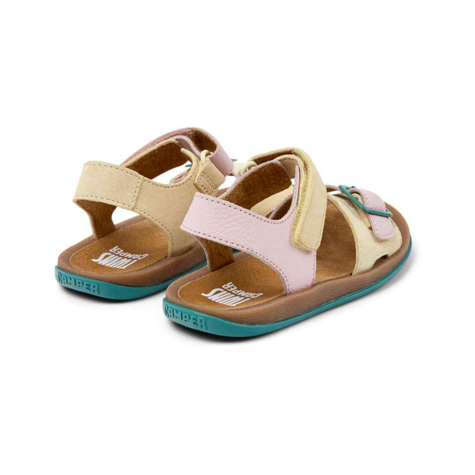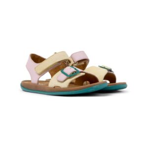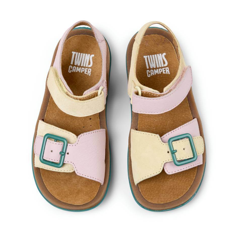 Κίτρινα και ροζ πέδιλα για κορίτσια από νουμπούκ και δέρμα χοίρου για παιδιά με αυτοκόλλητα για γρήγορη και εύκολη εφαρμογή και λαστιχένιες εξωτερικές σόλες (20% ανακυκλωμένες). Διαθέτουν ρυθμιζόμενο σχέδιο και εργονομικό πάτο φτιαγμένο από λάστιχο και ανακυκλωμένο φλοιό ρυζιού για φυσική κίνηση.