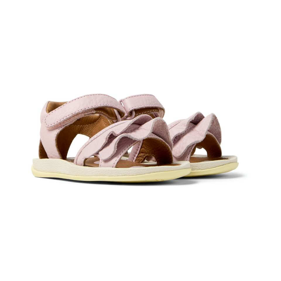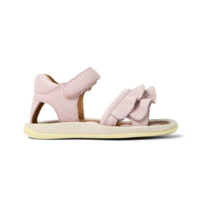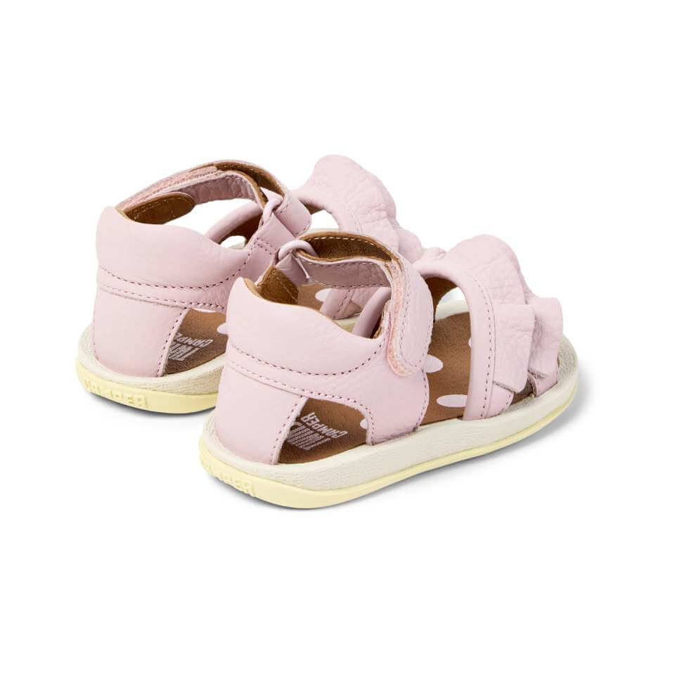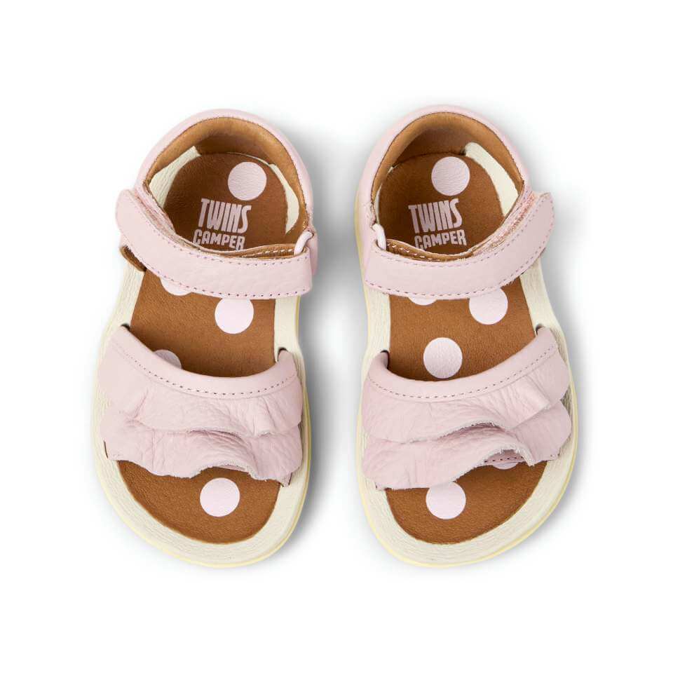 Ροζ με λευκό πουά σχέδιο, δερμάτινα πέδιλα για κορίτσια με αυτοκόλλητο στο κουντεπιέ.