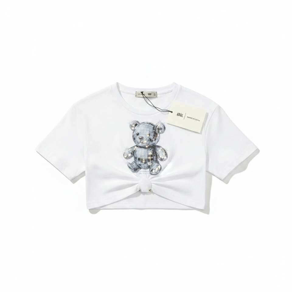 Cropped t-shirt για κορίτσια σε λευκό χρώμα με μοντέρνο print το αρκουδάκι της PCL σε disco style στο μπροστινό μέρος. Διαθέτει κοντά μανίκια και στρογγυλή λαιμόκοψη, ενώ η εφαρμογή του είναι στενή με σούρες στο κάτω μέρος που αναδεικνύουν τη σιλουέτα. Ιδανικό για casual και streetwear εμφανίσεις, συνδυάζεται εύκολα με jeans, σορτς ή φούστες για ένα νεανικό και stylish look. Κατασκευασμένο από άνετο βαμβακερό ύφασμα για καθημερινή χρήση.