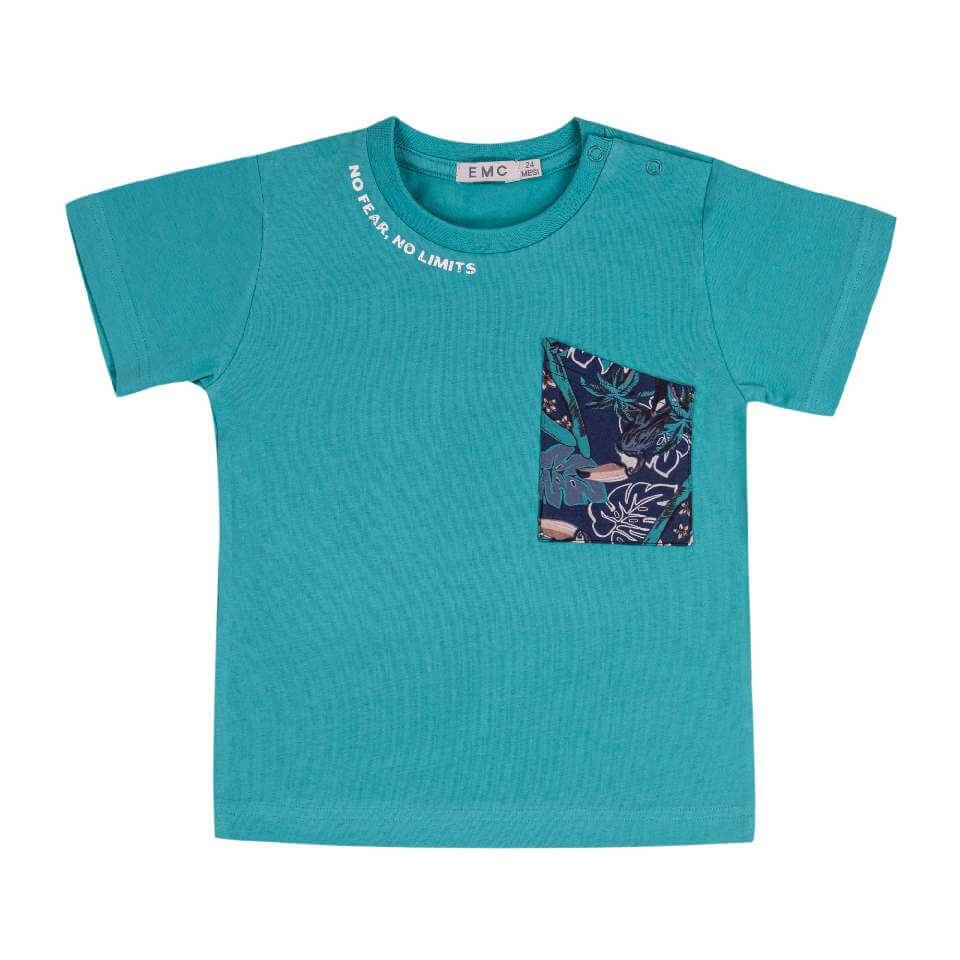 Έντονο, τροπικό στυλ για καθημερινές προκλήσεις! Αυτό το κοντομάνικο μπλουζάκι από απαλό, ελαστικό βαμβάκι ξεχωρίζει με το έντονο γαλαζοπράσινο χρώμα του και την ξεχωριστή τσέπη με τύπωμα ζούγκλας και τουκάν. Το σύνθημα “Χωρίς φόβο, χωρίς όρια” στη στρογγυλή λαιμόκοψη προσθέτει μια εμπνευσμένη, μοντέρνα πινελιά, ενώ τα κουμπιά με κούμπωμα στον ώμο εξασφαλίζουν γρήγορη και εύκολη εφαρμογή. Ιδανικό για μια δυναμική, ενεργητική εμφάνιση.