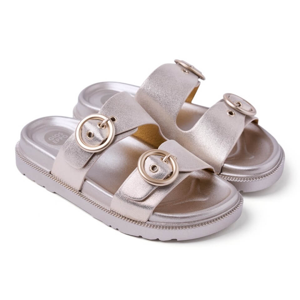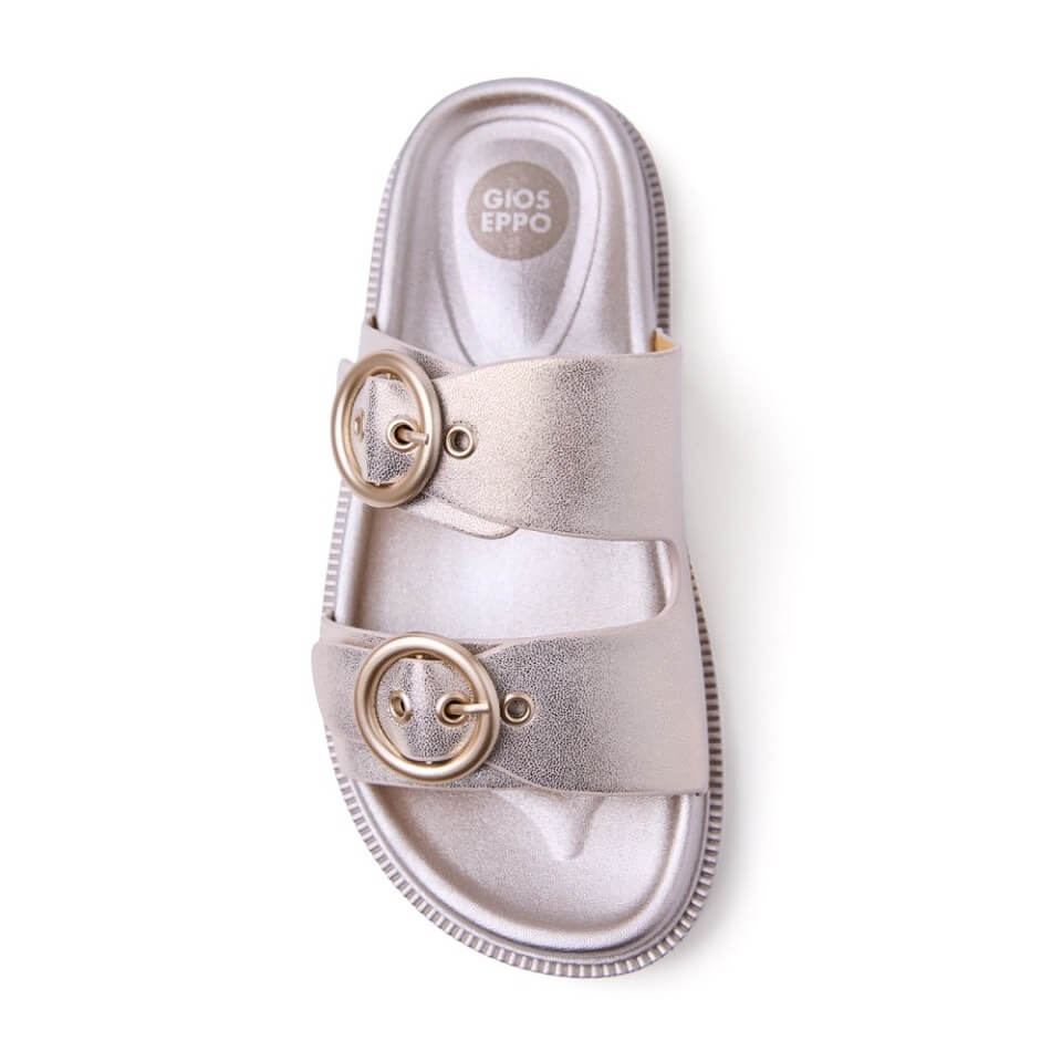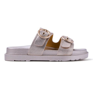 Μονόχρωμα σανδάλια με μεταλλικό φινίρισμα. Διαθέτουν επενδεδυμένο πάτο και ρυθμιζόμενες αγκράφες. Άνω μέρος και επένδυση από πολυουρεθάνη. Πάτος και σόλα από PVC.
