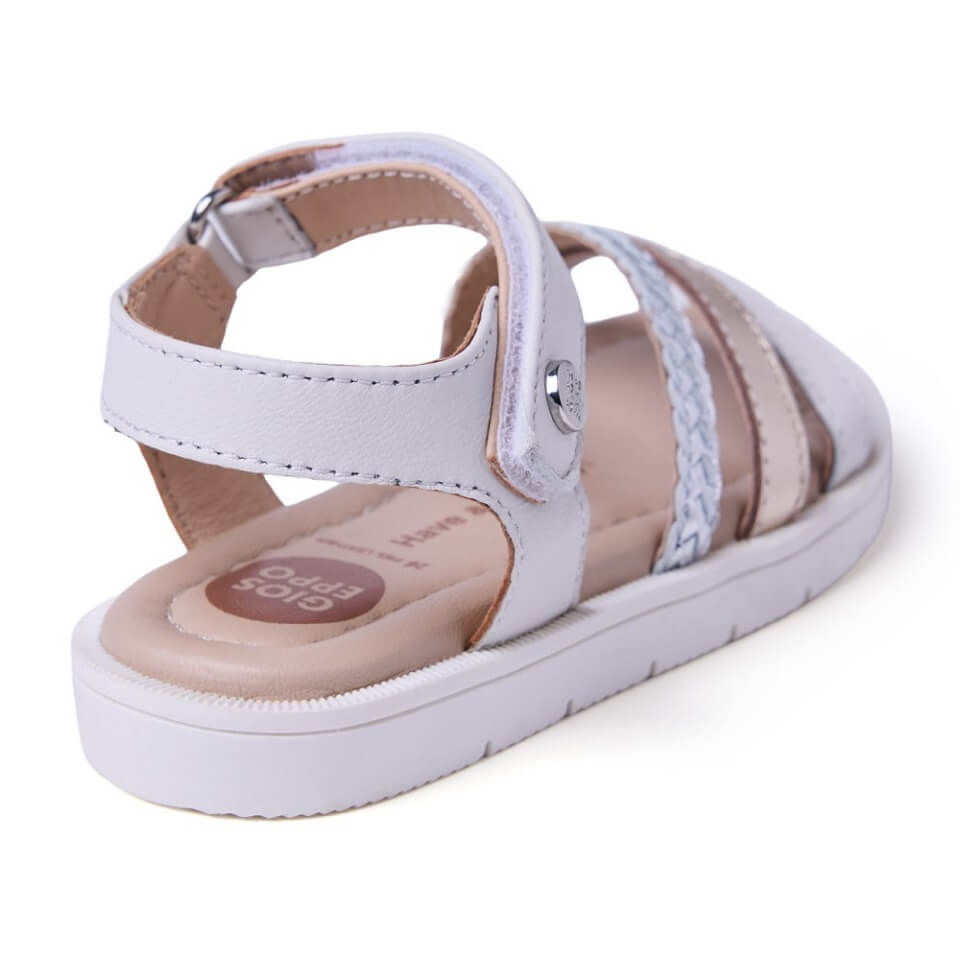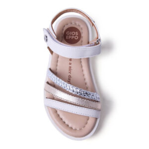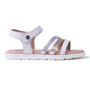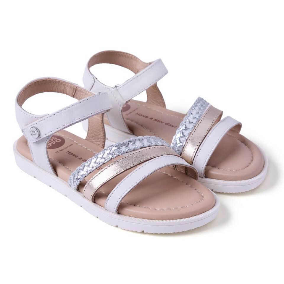Δερμάτινα, κομψά πέδιλα για κορίτσια σε λευκό χρώμα με χρυσά και ασημί λουράκια
