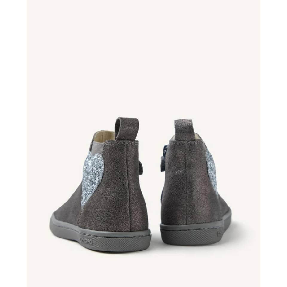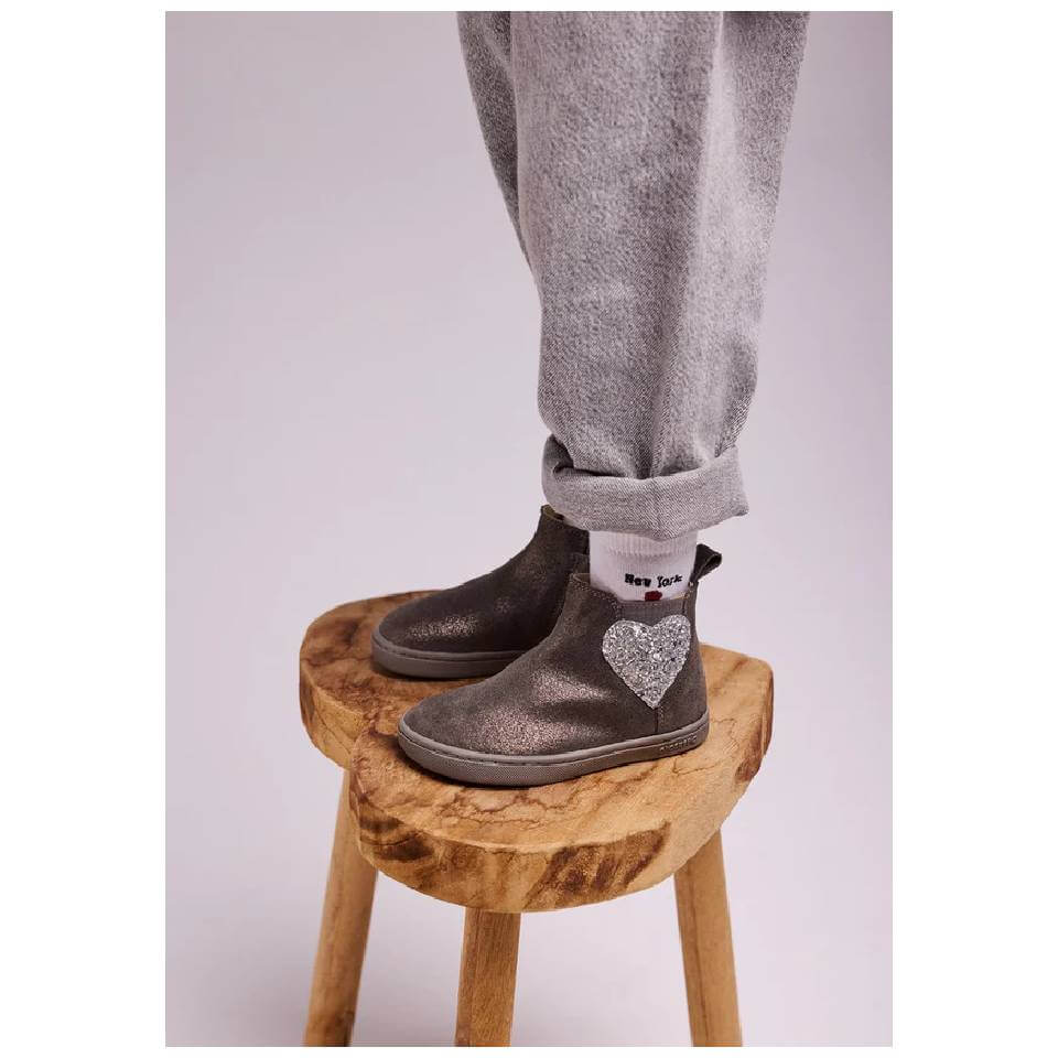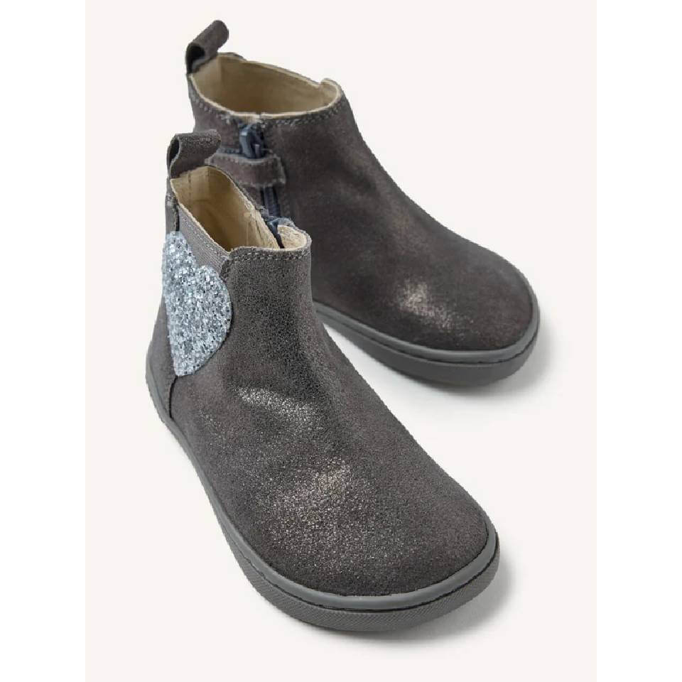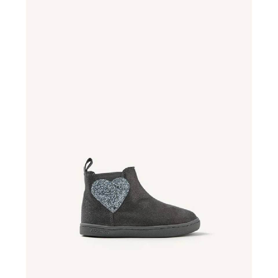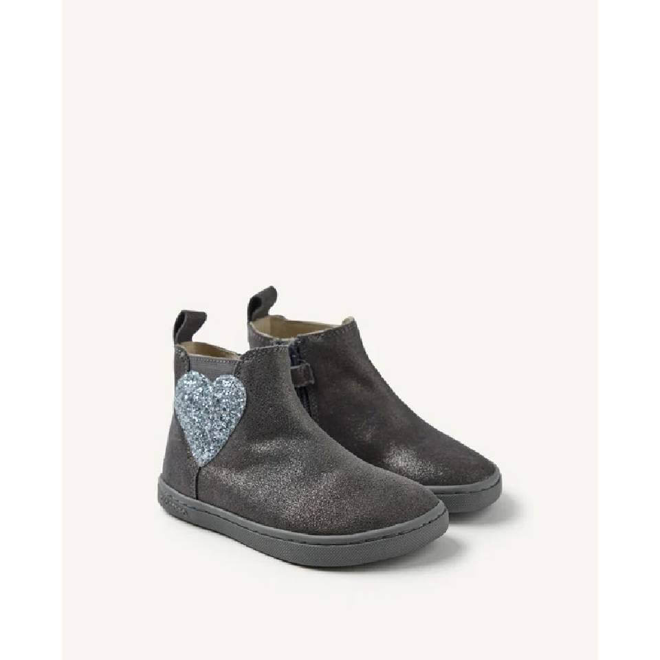 Μποτάκια από λαμπερό σουέτ δέρμα σε γκρι χρώμα. Διαθέτουν λάστιχο και ένα σχέδιο καρδιάς στην εξωτερική πλευρά και φερμουάρ στην εσωτερική πλευρά. Σχεδιασμένα σύμφωνα με τις μινιμαλιστικές τάσεις για να εξασφαλίζουν ένα φυσικό βήμα.