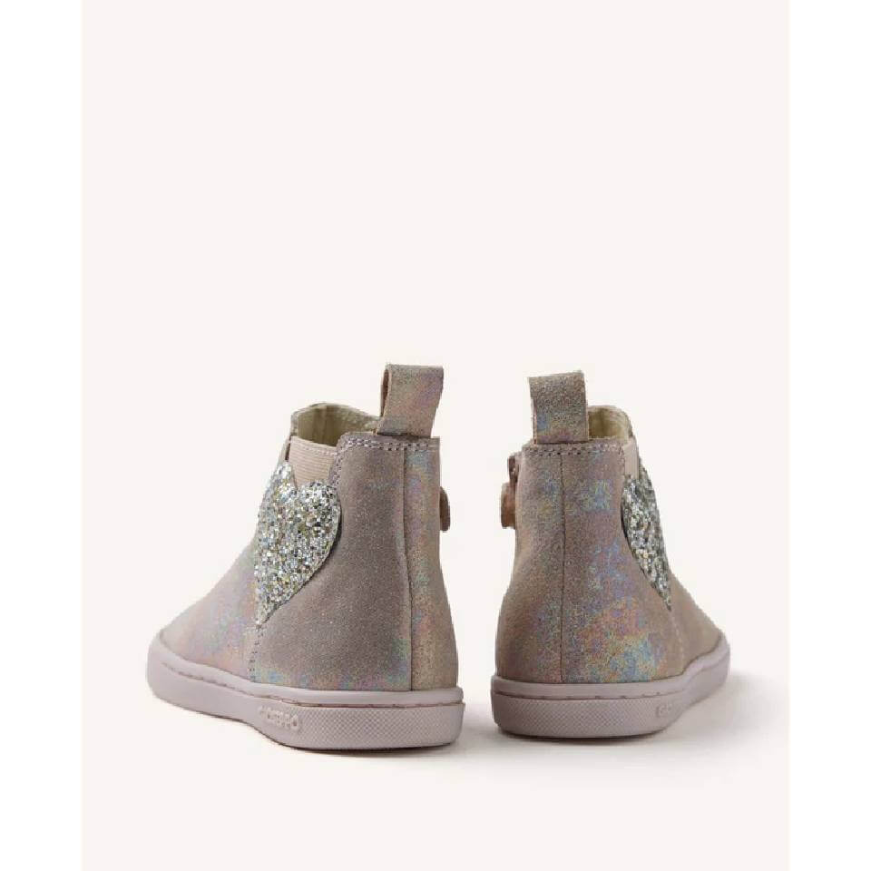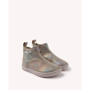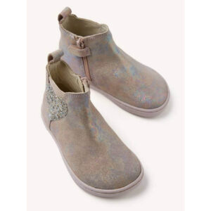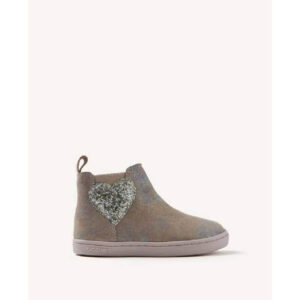 Μποτάκια από λαμπερό σουέτ δέρμα. Διαθέτουν λάστιχο και ένα σχέδιο καρδιάς στην εξωτερική πλευρά και φερμουάρ στην εσωτερική πλευρά. Σχεδιασμένα σύμφωνα με τις μινιμαλιστικές τάσεις για να εξασφαλίζουν ένα φυσικό βήμα.