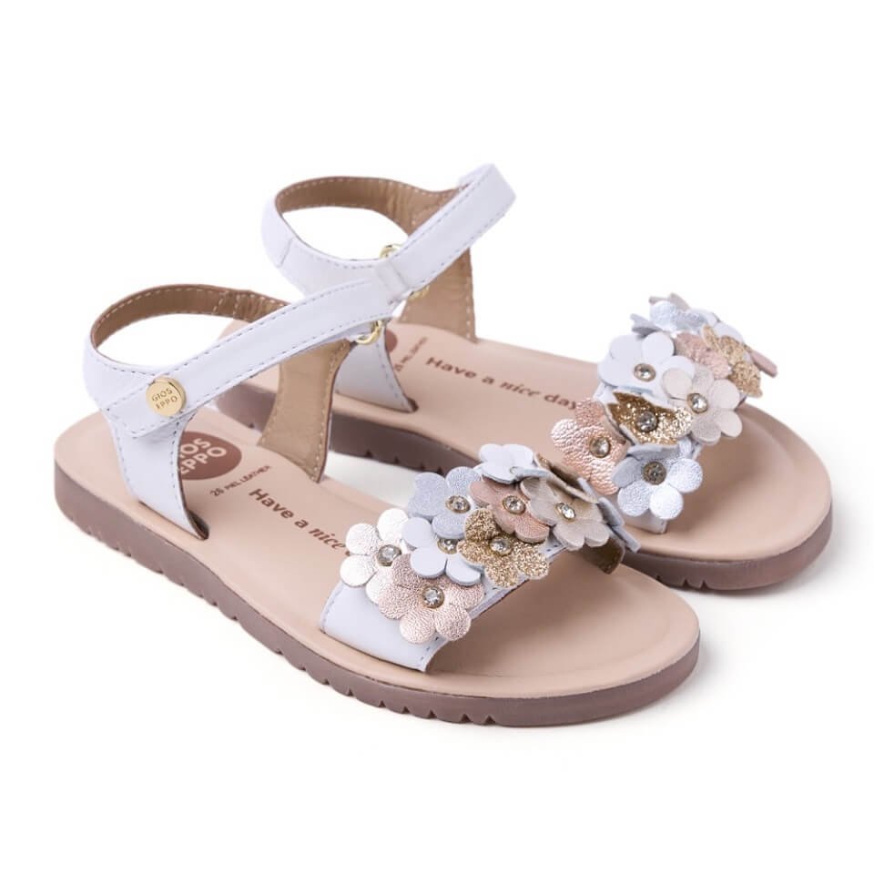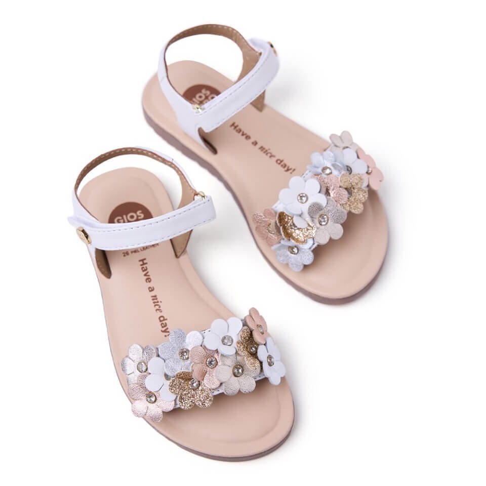 Δερμάτινα, κομψά πέδιλα για κορίτσια σε λευκό χρώμα με λουλούδια.