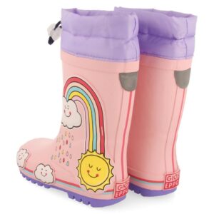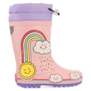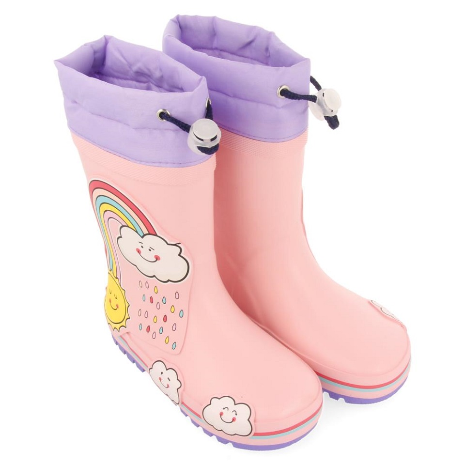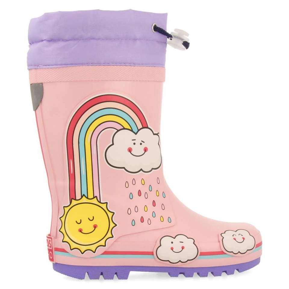 Ροζ γαλότσες με λαστιχένιο μπάλωμα ουράνιου τόξου. Εσωτερικές σόλες με μαξιλαράκι και υφασμάτινη επένδυση από πολυεστέρα. Ισχυρές αδιάβροχες αντιολισθητικές σόλες από φυσικό φελλό.