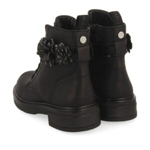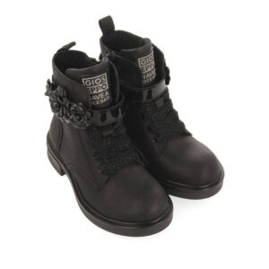 Μαύρα δερμάτινα αρβυλάκια με glitter και με αφαιρούμενη διακοσμητική λωρίδα με λουλουδάκια. Αναπνεύσιμες εσωτερικές σόλες από μικροΐνες και εξωτερική σόλα από καουτσούκ με αντικραδασμική προστασία. Κλείσιμο με φερμουάρ για εύκολα και γρήγορη εφαρμογή. Η εσωτερική σόλα είναι κατασκευασμένη από δέρμα από βυρσοδεψεία που ακολουθούν ένα πιο βιώσιμο πρωτόκολλο, σύμφωνα με τα πρότυπα της Leather Working Group (LWG).