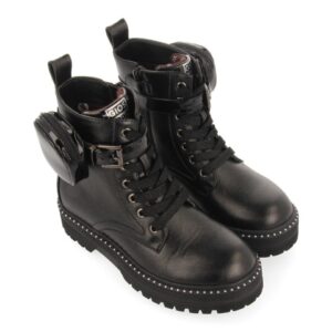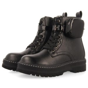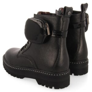 Μαύρα αρβυλάκια με κορδόνια με διακοσμητική αποσπώμενη τσαντάκι στο πλάι. Διαθέτει περλέ δερμάτινο φινίρισμα, σόλες με micro καρφιά στις ράβδους και εσωτερικό φερμουάρ για καλύτερη εφαρμογή. Αναπνεύσιμες εσωτερικές σόλες από μικροΐνες με άνετη αντικραδασμική προστασία, επένδυση από ύφασμα από πολυεστέρα που αναπνέει και σόλες από φελλό TPR.