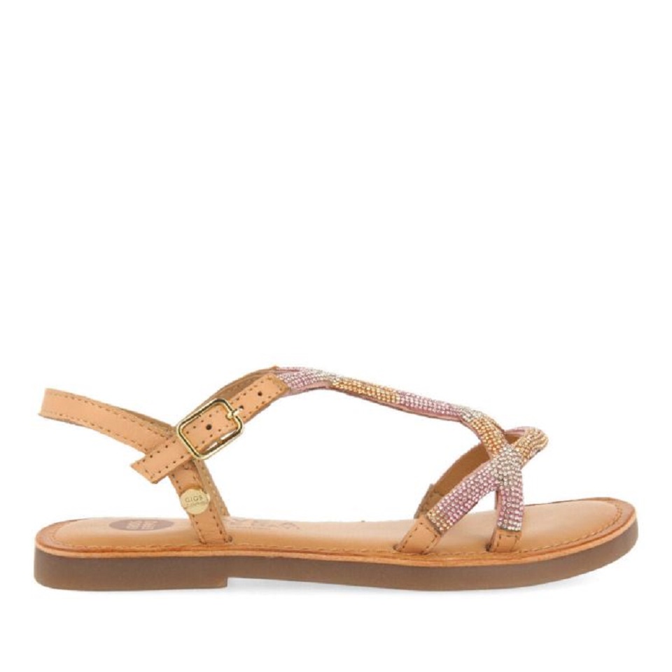 Ροζ δερμάτινα σανδάλια με διακοσμητικά πολύχρωμα μίνι κρύσταλλα.