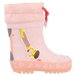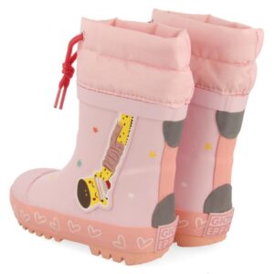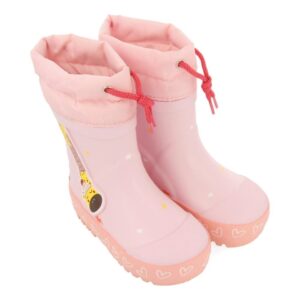 Ροζ γαλότσες με μπαλώματα από καουτσούκ και νάιλον μανσέτες. Μια σειρά από πολύχρωμα σχέδια σε αποχρώσεις του κίτρινου, του πορτοκαλί και του γκρι. Εσωτερικές σόλες με μαξιλαράκι και υφασμάτινη επένδυση από πολυεστέρα. Ισχυρές αδιάβροχες αντιολισθητικές σόλες από φυσικό φελλό με λεπτομέρειες αστεριών.