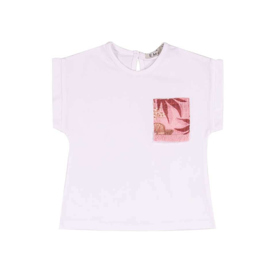 Λευκό κοριτσίστικο μπλουζάκι με στρογγυλή λαιμόκοψη από ελαστικό βαμβακερό ζέρσεϊ για άνετη και δροσερή εφαρμογή. Το στυλ διαθέτει κοντά μανίκια και τρύπα στην πλάτη με κουμπί. Το μπροστινό μέρος διαθέτει μια τσέπη σε αντίθεση με εξωτικό σχέδιο και ένα εκλεπτυσμένο κρόσσι στο στρίφωμα.