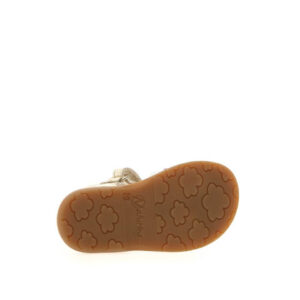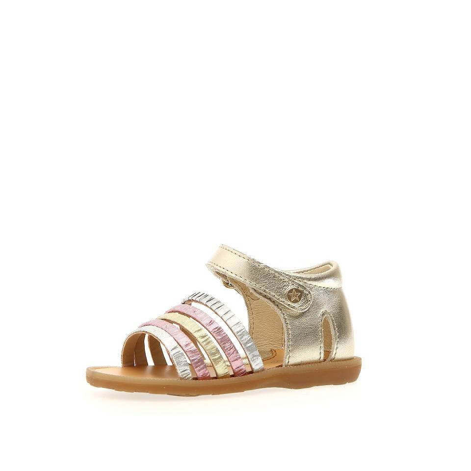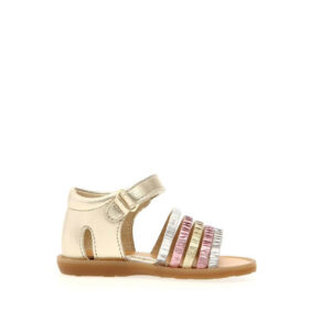 Δερμάτινα, ανατομικά πέδιλα με ποδική καμάρα, για μικρά κορίτσια σε χρυσό χρώμα και χρυσές, ασημί και ροζ λωρίδες. Με αυτοκόλλητο κούμπωμα στο κουντεπιέ για γρήγορη και εύκολη εφαρμογή. Με ελαφριά, εύκαμπτη δομή που δίνει στα παιδιά ευκολία στην κάθε κίνηση και στο παιχνίδι. Ανθεκτικά με σταθερό κράτημα και σωστή υποστήριξη στη φτέρνα και στον αστράγαλο, κατάλληλα για τα πρώτα βήματα.