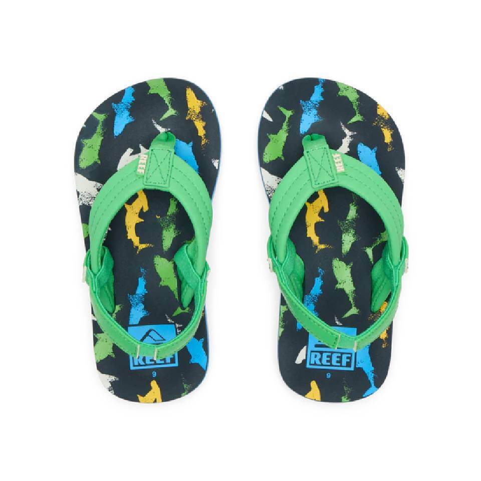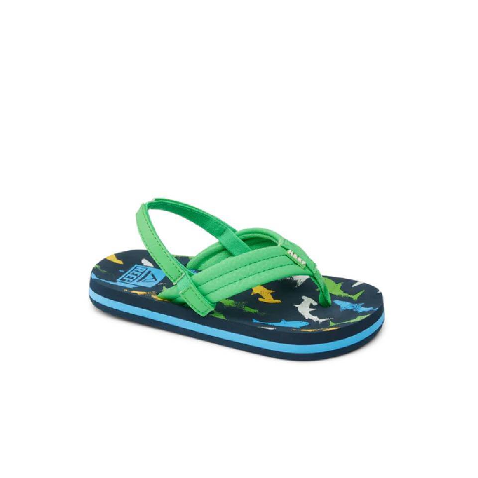 Σαγιονάρες για μικρά παιδιά σε μπλε και πράσινο χρώμα με σχέδιο καρχαρίες.